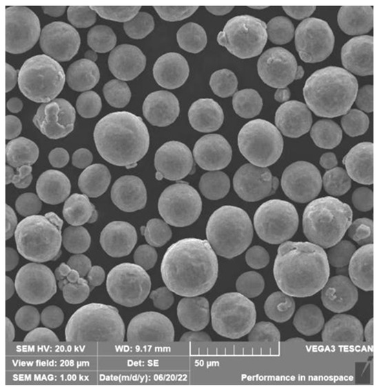 Atomized spherical titanium powder [27,28] from Shandong Lianhong New Material Technology Co., Ltd., Shandong, China was used in this research. The mean particle size was 34.2 μm. The particles’ morphology and chemical composition are presented in Table 1 and Figure 1, respectively. The binder system was composed of PEG (Beijing Solarbio Technology Co., Ltd., density of 1.2 g/cm3), PMMA (Taiwan Chimei, Shandong, China density of 1.19 g/cm3), SA (Dongguan Hongxing New Material Co., Ltd., Shandong, China, density of 0.94g/cm3) and PVP (Aladdin reagent, Shandong, China, density of 1.144 g/cm3).
