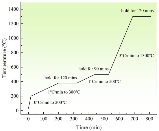 Thermal debinding and sintering were conducted in a vacuum sintering furnace. The samples were sintered at 1300 °C for 2 h. The holding time of 120 min at 380 °C is due to the reaction of titanium with carbon, oxygen and nitrogen at about 400 °C, ensuring the decomposing gas has enough time to escape and thus avoiding the increase in impurity content in the final sintered samples. The parameters were also set according to the TG curves and the details are displayed in Figure 4. The relative density of the sintered samples was calculated after measuring the density.