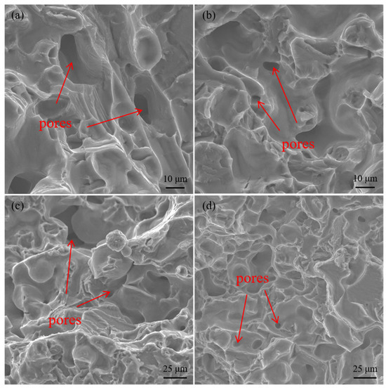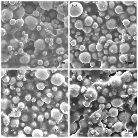 Figure 6 presents the SEM micrographs of injection-molded samples with different contents of PVP. For the feedstock with zero PVP, many large pores can be seen in the sample, displayed in Figure 6a. When the PVP content was 10 wt.%, the number and size of pores both decreased, as shown in Figure 6b. For Feedstock C, barely any pores are present on the surface of the sample; the titanium powder and binder are evenly mixed. However, tiny pores appear inside Feedstock D, indicated in Figure 6d.