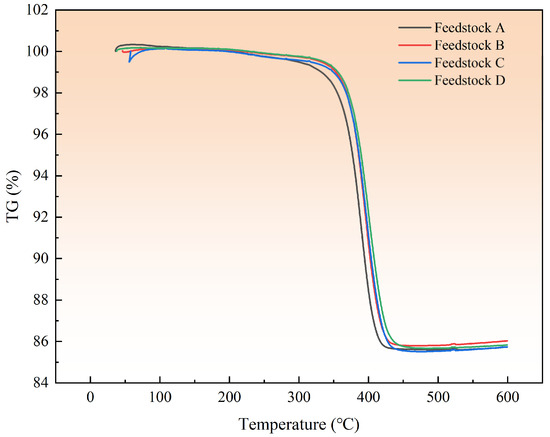 The TG curves of the four different feedstocks are presented in Figure 8. As can be seen, the initial and final decomposition temperatures increase with the increase in the contents of PVP. The mass loss of samples is greatest in the range of 250–450 °C. A low heating rate should be set in this range during the thermal debinding process so that the binder components have enough time to escape from the sample [31].
