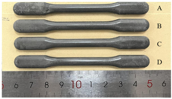 The surface morphologies of the injection-molded samples of different feedstocks are shown in Figure 9. As can be seen from Figure 9, samples from Feedstocks B, C and D have better appearance than the sample from Feedstock A. It seems that the addition of PVP can improve the appearance of samples to a certain extent.