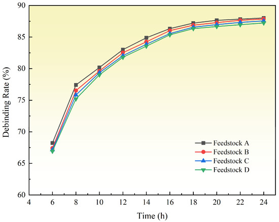 The debinding process of PEG and PVP molecules is mainly driven by the concentration gradient. The injection-molded samples with different PVP contents were debonded at 40 °C for 24 h. The formula for calculating the debinding rate is as follows: