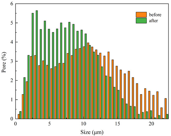 The micro-CT test was conducted before and after water debinding of sample C to further investigate the interconnected pores. Figure 14 provides the 3D images of the internal pores of Feedstock C, which were obtained using a micro-CT test. Figure 14a presents the pores of the sample before water debinding, while (b) shows the pores after water debinding, represented by the small spheres. There are few spheres in Figure 14a, but the number of pores increased significantly after water debinding (Figure 14b). The data about the size distribution of pores are presented in Figure 15, where orange represents the sample before water debinding and green represents the sample after water debinding. It can be concluded from Figure 15 that the number of small holes in the sample increases significantly after water debinding. The main reason is that PEG and PVP in all parts of the injection-molded samples dissolve in water after water debinding, resulting in many small holes.