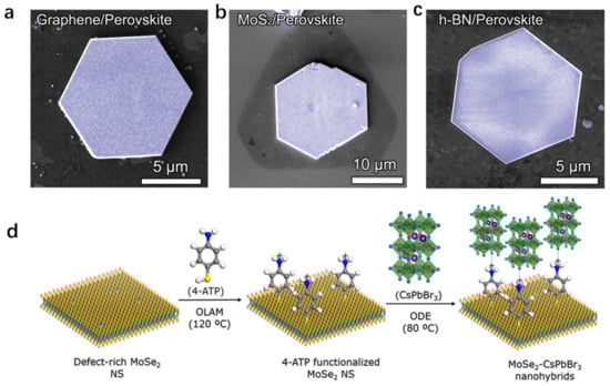 - Hassan, M.S.; Basera, P.; Bera, S.; Mittal, M.; Ray, S.K.; Bhattacharya, S.; Sapra, S. Interfaces, Enhanced photocurrent owing to shuttling of charge carriers across 4-aminothiophenol-functionalized MoSe2–CsPbBr3 nanohybrids. ACS Appl. Mater. Interfaces 2020, 12, 7317–7325. [Google Scholar] [CrossRef]