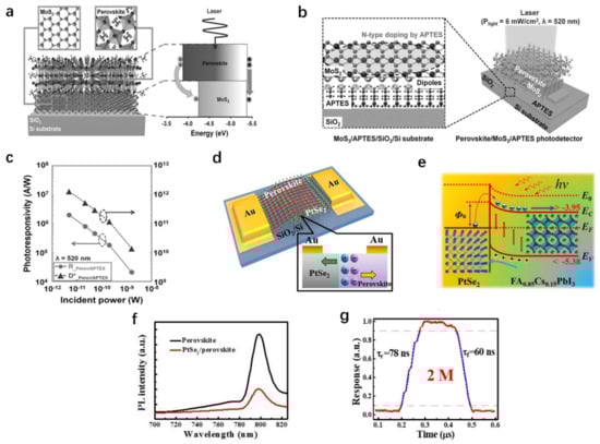 - Kang, D.H.; Pae, S.R.; Shim, J.; Yoo, G.; Jeon, J.; Leem, J.W.; Yu, J.S.; Lee, S.; Shin, B.; Park, J.H. An Ultrahigh-Performance Photodetector based on a Perovskite-Transition-Metal-Dichalcogenide Hybrid Structure. Adv. Mater. 2016, 28, 7799–7806. [Google Scholar] [CrossRef]