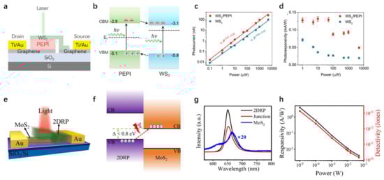 - Zhou, H.; Lai, H.; Sun, X.; Zhang, N.; Wang, Y.; Liu, P.; Zhou, Y.; Xie, W. Van der Waals MoS2/Two-Dimensional Perovskite Heterostructure for Sensitive and Ultrafast Sub-Band-Gap Photodetection. ACS Appl. Mater. Interfaces 2022, 14, 3356–3362. [Google Scholar] [CrossRef]