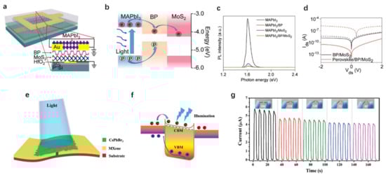 - Sun, B.; Xi, S.; Liu, Z.; Liu, X.; Wang, Z.; Tan, X.; Shi, T.; Zhou, J.; Liao, G. Sensitive, fast, and stable photodetector based on perovskite/MoS2 hybrid film. Appl. Surf. Sci. 2019, 493, 389–395. [Google Scholar] [CrossRef]