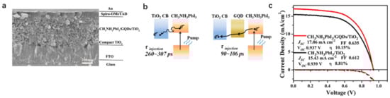 | FTO/TiO2/GQDS/CH3NH3PbI3/Spiro-OMeTAD/Au | 0.937 | 17.06 | 0.635 | 10.15 | [85] |