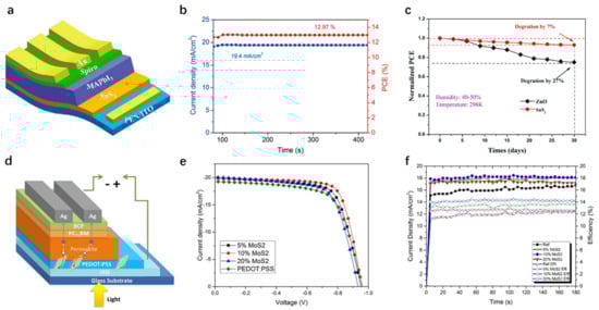 | ITO/PEDOT:PSS, MoS2/MAPbI3/PC71BM/BCP/Ag | 0.9522 ± 0.001 | 72.3 ± 0.9 | 0.723 ± 0.009 | 14.2 ± 0.39 | [91] |