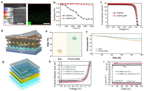 - Yang, L.; Wang, B.; Dall’Agnese, C.; Dall’Agnese, Y.; Chen, G.; Jena, A.K.; Wang, X.-F.; Miyasaka, T. Engineering, Hybridization of SnO2 and an In-Situ-Oxidized Ti3C2Tx MXene Electron Transport Bilayer for High-Performance Planar Perovskite Solar Cells. ACS Sustain. Chem. Eng. 2021, 9, 13672–13680. [Google Scholar] [CrossRef]