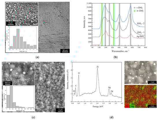 Structural characterization of the samples: (a) SEM top view images of the ZrO2 substrate and the ZrO2 grain size distribution histogram; (b) Raman spectra of the ZrO2—1, Ag/ZrO2, and ZrO2—2 substrates; (c) SEM top view images of the Ag/ZrO2 substrate and the Ag particle size distribution histogram; (d) EDX spectrum and EDX scan of the Ag/ZrO2 substrate.