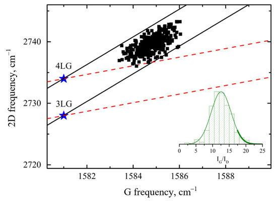 Experimental dependences of 2D band position on position of G band for graphene on copper. The bold solid line (with a slope of ~2.2) passing through the blue star marks are responsible for the biaxial strain in the ideal graphene. Dashed red lines (with a slope of ∼0.7) are responsible for the charge carrier concentration with fixed biaxial strain. The blue star markers correspond to unstressed and undoped multilayer graphene [38] defined taking into account the excitation wavelength used in current work [39] Inset: histogram of the ratio of the intensities of the G band to the D band.