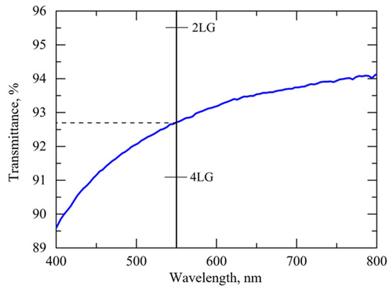 To study the Gr structure in more detail, it was characterized by Raman spectroscopy. As a rule, the graphene Raman spectrum contains G, 2D, and D prominent bands [35,36]. The first one (~1582 cm−1) is attributed to a doubly degenerated phonon mode of E2g symmetry from the center of the Brillouin zone. The 2D band (~2710 cm–1) appears as a result of the resonant light scattering in which two equal-energy phonons are involved. However, the light is scattered in the opposite direction of the pulse, thus providing data on the graphene layers order. The last band (~1352 cm−1) helps to reveal defects in the graphene layers. Therefore, the Raman mapping of graphene on copper was performed. A laser with excitation energy 2.62 eV (λ = 473 nm) was utilized. The size of the mapped area was 48 × 48 μm2. The number of points on the map was 20 × 20. The intensities, positions, and half-widths of the Raman spectral bands were determined using the Lorentz approximation. The correlation between the position of the 2D band and the position of the G band was plotted based on data from Raman mapping (Figure 2). The correlation analysis of the G and 2D bands positions was based on that developed in the [37,38] approach, indicating a few-layer structure of graphene (~3 layers), which was confirmed using transmission optical spectroscopy (Figure 3).