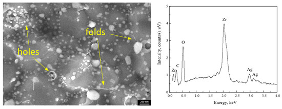 SEM top view image and EDX spectrum of the Gr/Ag/ZrO2 sample.