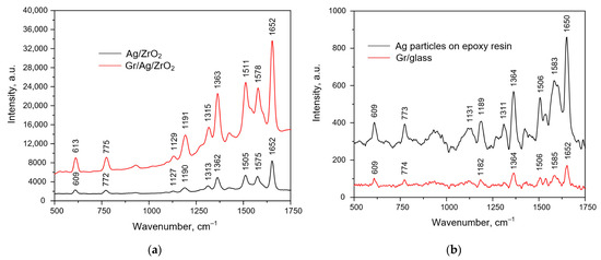 Mean SERS spectra of R6G molecules adsorbed from 10–6 M solution on the surface of the different substrates: (a) Ag/ZrO2 and Gr/Ag/ZrO2; and (b) Ag particles on epoxy resin and Gr/glass.