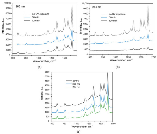 Mean SERS spectra of R6G molecules adsorbed from 10–6 M solution on the surface of (a,b) the Ag/ZrO2 substrates, (c) the control SERS-active substrates, and exposed to 365 nm or 254 nm irradiation.