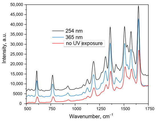 The final step of the research was devoted to revealing the UV exposure effect on the Gr/Ag/ZrO2 substrate properties. The expected improvement of the photocatalytic activity was not found. To the contrary, we observed an undoubted increase in SERS activity because the spectra intensity rose twice (~40%) after the 365 nm exposure and 2.3 time (~47%) in the case of 254 nm irradiation for 2 h (Figure 8), which is explained by the different response of surface and bulk zirconia crystals to the short and long UV wavelengths.
