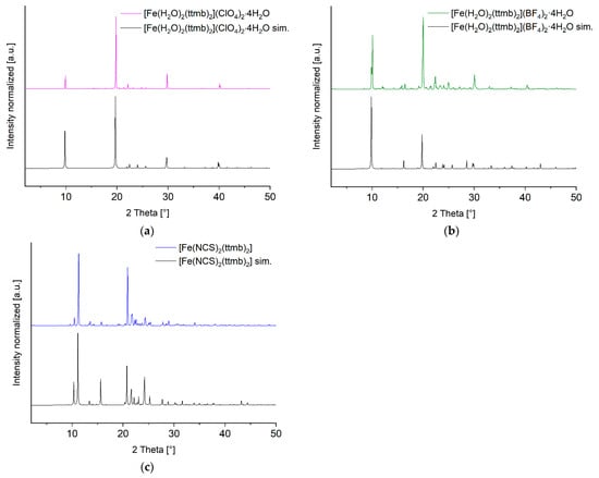The IR spectra of the coordination polymers 1–3 (see Supplementary Materials, Section S3) show their indicative bands for the ttmb linker at around 977 cm−1 for ν(C=C) and 1519 cm−1 for ν(C=N). Additionally, the characteristic bands for the anions of the compounds can be detected for the ClO4− of 1 at ν(Cl–O) = 621 cm−1, 1078 cm−1. The band of the anion BF4− of 2 can be observed at ν(B–F) = 1047 cm−1 and the anion of 3 at ν(NCS) = 2046 cm−1 [69].
