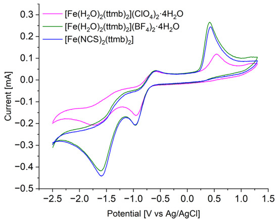 Cyclovoltammograms of compounds 1–3 (pink = 1, green = 2, blue = 3) spin-coated onto a glassy carbon electrode at T = 293 K.