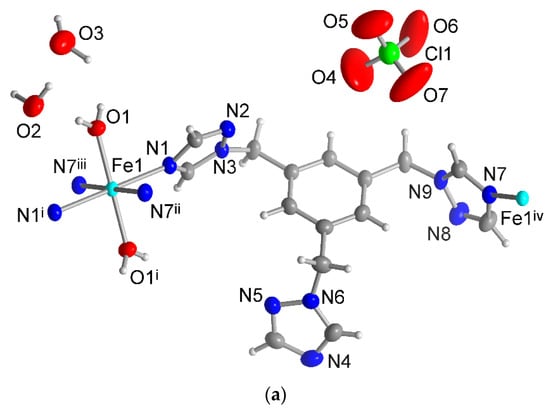 Three novel iron(II) coordination polymers, namely [Fe(H2O)2(ttmb)2](ClO4)2·4H2O (compound 1), [Fe(H2O)2(ttmb)2](BF4)2·4H2O (compound 2) and [Fe(NCS)2(ttmb)2] (compound 3), were synthesized with the linker 1,3,5-tris((1H-1,2,4-triazol-1-yl)methyl)benzene (ttmb) (see Section 2.1). Under a polarized-light Leica M80 microscope (Leica, Wetzlar, Germany), suitable single crystals were carefully selected and covered with oil on a cryo-loop. The single crystal diffraction measurement for compounds 1 and 3 were carried out on a Rigaku XtaLAB Synergy S diffractometer (Rigaku, Tokyo, Japan) with a hybrid pixel array detector and a micro-focus sealed X-ray tube, PhotonJet copper X-ray source (λ = 1.54184 Å). For cell refinement, data reduction and absorption correction CRYSALISPRO was used [58]. For compound 2, the measurement was performed on a Bruker Kappa APEX2 CCD X-ray diffractometer (Bruker, Billerica, MA, USA) with a microfocus sealed tube molybdenum X-ray source (λ = 0.71073 Å) and a multi-layer mirror monochromator. Cell refinement was performed with APEX2, data reduction with SAINT and adsorption correction with SADABS [59,60,61]. The crystal structures for compounds 1–3 were solved using OLEX2 with SHELXT and the refinement was done with SHELXL [62,63,64]. The graphics were drawn with the DIAMOND 4.0 software [65].