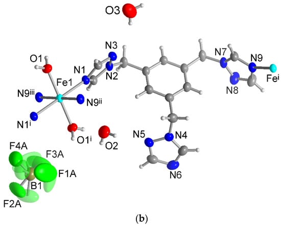 Single-crystal X-ray analysis reveals that the isostructural complexes 1 and 2 crystallize in the monoclinic space group P21/n. The asymmetric unit consists of one half of an Fe(II) atom (on an inversion center), one ttmb ligand, one coordinated and two uncoordinated water molecules, and one uncoordinated ClO4− or BF4− anion (Figure 3). Due to the steric hindrance of the ttmb ligand and the interactions with the anions, the metal center possesses a somewhat distorted octahedral geometry with a FeO2N4 coordination environment (see Supplementary Materials, Section S7).