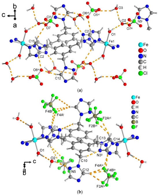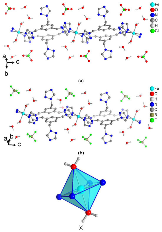 Every ttmb ligand functions as a twofold bridge and connects two Fe(II) atoms with an anti-conformation of the coordinating triazole groups. The spanned distance between the Fe atoms is 13.46 Å. Every Fe(II) atom is connected to its neighbor by two ttmb linkers in a double-chain structure (Figure 4). Since the perchlorate and tetrafluoroborate anions have similar sizes, similar geometries and also similar chemical hardness, it was expected that both compounds 1 and 2 are isostructural [71]. The ionic radius of ClO4− is 2.37 Å, and that of BF4− is 2.29 Å [36].