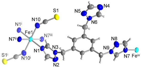 The X-ray crystallographic analysis reveals that compound 3 crystallizes in the triclinic space group P. The asymmetric unit is composed of one half of an Fe(II) atom (on an inversion center), one ttmb ligand and one coordinated NCS− anion, as shown in Figure 6. The Fe(II) metal is octahedrally coordinated by six nitrogen donor atoms from four triazole rings in the equatorial plane and two trans-coordinated NCS− in the axial positions.