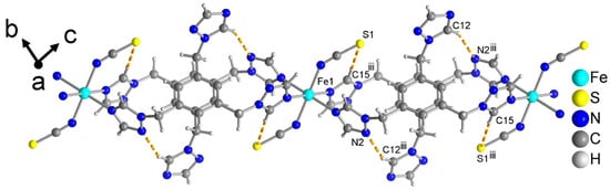 The double chain of compound 3 with the intrachain C–H···N/S hydrogen-bonding interactions as yellow-orange dashed lines. See Table S4 for details of the H-bond interactions (distances and angles). Symmetry transformation: iii = −x + 1, −y + 1, −z + 1.