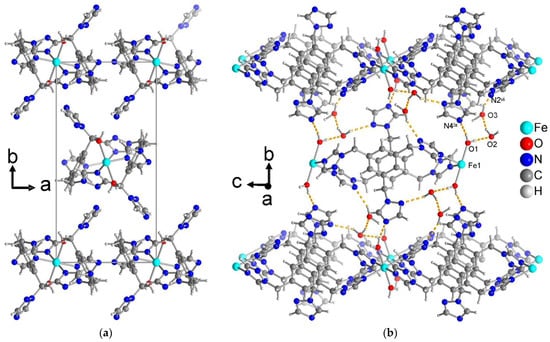 All three compounds form one-dimensional chain structures that interdigitate with the non-coordinated, dangling triazole rings as shown in Figure 8a. The supramolecular organization of the parallel chains is mediated by hydrogen-bonding interactions. In the isostructural compounds 1 and 2, there are O–H···O and O–H···N interactions from the aqua ligands to the crystal water molecule and to a free triazole-N from the adjacent chain. Further, the crystal water molecule also forms O–H···N bonds to this adjacent chain (Figure 8b). Thus, the chains are interconnected with each other by strong hydrogen bonding. The non-iron-coordinating triazole ring is therefore instrumental for the supramolecular arrangement of the parallel chains. It is also evident, however, that there is no steric hindrance of this ring to an additional metal coordination. Possibly, if less hydrogen-bonding organic solvents are used in the synthesis, this third triazole group could brought to metal coordination.