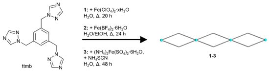 A schematic presentation of the synthesis of the complexes 1–3 is given in Scheme 1. The compounds had to be prepared with different molar metal:ligand ratios, which were optimized beforehand, in order to obtain crystals of sufficient quality for single-crystal X-ray analysis. The molar M:L ratio for compound 1 was 2:3, for compound 2 it was 2:1 and for compound 3 it was 1:2. The synthesis for the crystals of 1 was carried out by combining the metal salt and the linker in water. For compound 2, the preparation was different: Two separate warm solutions were assembled and later combined. The first solution contained the metal salt with ascorbic acid and the second one contained the linker. This approach was chosen to avoid rapid precipitation as powders. A similar synthesis was done for 3. Additionally, a third warm solution with NH4NCS was prepared and in order to form the intermediate product, ferrous nitrate; the solution of the metal salt and ascorbic acid were combined with this solution first, and then the solution of the linker was added [68]. The crystals have a colorless or a light-yellow color; microscopic images of the crystals can be found in the Supplementary Materials, Section S5.