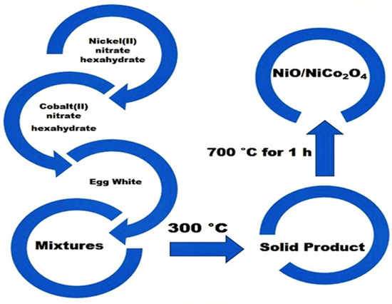 Compounds containing nickel and cobaltite have been produced using a variety of methods, such as sol-gel, coprecipitation, electrodeposition, microwave, and hydrothermal approaches [6,7,8,9]. These techniques have produced nanostructured NiCo2O4 in a variety of sizes and shapes [10,11,12,13,14,15]. For instance, Cheng et al. reported the preparation of NiO/NiCo2O4 composites with a unique yolk–shell structure using a simple hydrothermal route, followed by annealing at a high temperature [16]. NiO/NiCo2O4 nanocomposite was also prepared using a simple and eco-friendly method employing Urtica extract, followed by heating at a high temperature for the determination of dopamine [17]. A hetero-structure, necklace-like NiO–NiCo2O4 hybrid was prepared using a typical hydrothermal method for Li–oxygen batteries [18]. Exchange bias behaviors up to room temperature have been observed in a NiCo2O4/NiO nanoparticle system prepared using the chemical co-precipitation method [19]. However, one of the problems encountered in most of the preparation procedures of cobaltite materials is a high calcination temperature and high crystallinity, with a subsequent decrease in the electrochemical activity and the specific capacitance of these materials. In this way, the challenge will be to develop the preparation of these materials. High purity, low grain size, a superior large specific surface area, and superior electrical conductivity can only be achieved through homogenous multi-component metal oxide materials prepared using minimal-cost, lower-energy techniques. Even though there are other ways to create spinel NiCo2O4, the auto-combustion strategy is now regarded as one of the most attractive synthesis methods, due to its inherent advantages, which include homogenous heat transmission and an incredibly quick heating duration [20,21]. Utilizing combustion technology, rapid heating can be accomplished through efficient energy transmission. Furthermore, the homogenous heating of the precursor solution caused by auto-combustion or heating up enables the rapid achievement of a uniform distribution of particle size. Consequently, the auto-combustion method is more efficient than the conventional routes for preparing various oxide nanoparticles. The added value of this method increases when it relies on natural materials as fuel in the combustion process. We describe in this study the synthesis of porous NiO/NiCo2O4 nanomaterials utilizing a replication of the egg-white-assisted combustion technique, along with rapid air heating at 700 °C to remove all or some of the carbon ash generated during the combustion process.