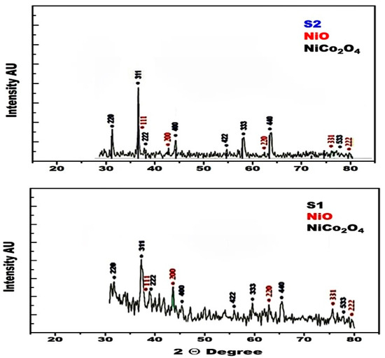 A preliminary investigation based on X-ray analysis revealed that a virgin sample that had not been treated with egg white possessed an amorphous feature. The NiO/NiCo2O4-NPs-containing S1 and S2 XRD patterns are presented in Figure 2. The indexing planes (220), (311), (222), (400), (422), (333), (440), and (533) are represented by the peaks in these patterns. These peaks at 2θ values are 31.24°, 36.80°, 38.51°, 44.76°, 55.59°, 59.29°, 65.16°, and 77.25°, respectively. These correspond to the reported values for NiCo2O4 NPs (PDF No. 73-1702). For NiCo2O4 (major phase), all of the diffraction peaks can be indexed as having a typical cubic spinel structure. On the other hand, at degree 2θ = 37.03, 43.02, 62.48, 74.91, and 78.80, respectively, there is another set of diffraction peaks that are indicative of the indexing planes (111), (200), (220), (311), and (222), respectively. This is consistent with the NiO NPs stated values (PDF No. 78-0429). For NiO, the conventional cubic structure may be indexed for all of the diffraction peaks. The examined solid’s XRD patterns showed no evidence of any other phases. Increasing the calcination temperature to 700 °C resulted in a rise in the peak height of the NiCo2O4 NPs and a decrease in that of the NiO NPs, indicating an increase in the nickel cobaltite.