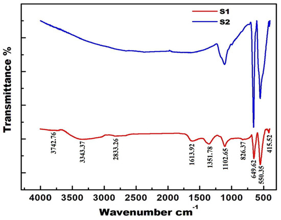 The FTIR spectral analysis of the NiO/NiCo2O4 ranging from 4000 to 400 cm−1 is presented in Figure 3. The vfrious ordering positions on the structural characteristics of the synthesized composites, and their locations in the crystal structure, are revealed by the spectra. The space group of cobaltites is usually Fd3m, and its crystal structure is spinel. The group theoretical calculations have revealed that the vibration spectra of the spinel cobaltites show the following two basic infrared active modes: a high frequency band (ν1) at around 600 cm−1 is the tetrahedral (A) site and a low frequency band (ν2) at about 422 cm−1 is the octahedral (B) site. The synthesized cobaltite’s absorption bands in this investigation fall within the predicted range. The absorption bands are visible at 3343.4, 1613.9, 1351.8, 1102.7, 826.4, 649.6, 550.3, 422, and 415.5 cm−1 in the NiO/NiCo2O4 nanoparticles. According to Waldron [24], the high frequency band ν1 at around 550.3 cm−1 and the low frequency band ν2 at around 415.5 cm−1 are attributed to that of tetrahedral and octahedral complexes of the spinel structure, respectively. New bands ν1* and ν2* at 535 and 415.5 cm−1 are assigned to the divalent tetrahedral/octahedral metal ions and the oxygen ion complexes, respectively. However, the existence of strong bands at 698 and 826.4 cm−1 indicates the presence of NiO [25,26]. The numerous vibrational modes of the carbon groups, on the other hand, are responsible for the bands at 1102.3 and 1351.8 cm−1. These bands are attributed to the C–O, C–OH, and/or C–H bonds’ stretching vibrations [21]. A broad band at 1613.9 cm−1, which indicates the presence of a hydroxyl group on the surface of the metal ions, indicates O–H bond stretching vibrations. The band at 3343.4 cm−1 may possibly be connected to a common band attributed to the bending manner of the absorbed water as moisture, which disappears due to heating at 700 °C, as shown in the S2 sample [21].