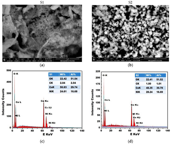 According to the SEM images shown in Figure 4a,b, the freshly prepared composites (S1 and S2) are primarily constructed of spherical and cube nanoparticles. The S1 sample contains spherical nanoparticles with dimensions ranging from 8 to 19 nm, which are clearly indications of a loosely packed porosity structure. We can characterize the S1 sample with having a sheet structure and a delicate, spongy appearance. Nonetheless, the porous structure and interaction space between the NiO/NiCo2O4 nanoparticles aid the improvement of the specific surface area by improving ion transport, reducing electron migration, and maintaining chemical stability. In contrast, the SEM picture for the S2 sample shows cube particles interspersed with some spherical particles, with an overall average size of 27 nm. These outcomes agree with the XRD analysis. On the other hand, several agglomerations in the S1 and S2 samples also showed a higher tendency. In fact, the majority of the manufactured composites’ attributes, including their surface and magnetic qualities, will change due to the evident morphological changes brought about by the heat treatment.
