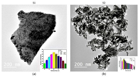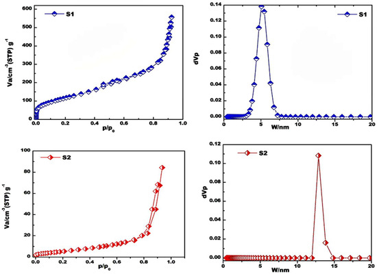 Studying the surface properties of the produced samples is necessary in order to demonstrate that they are composed of porous materials. Therefore, as seen in Figure 6, the surface characteristics of the S1 and S2 nanocomposites were investigated by employing N2 adsorption/desorption isotherms at −196 °C. These isotherms enabled us to determine the different surface properties of the studied samples, as shown in Table 3. After examining these isotherms, it was found that they belong to type-II, with a type H3 hysteresis loop, according to the IUPAC classifications [27]. In addition, these isotherms confirm that the used preparation method resulted in the formation of mesoporous nanocomposites. Additionally, based on the change in the adsorption process at a high relative pressure (P/Po = 0.83–0.98), we can deduce from the shape of the isotherm that a condensation process in the inter-particle voids occurred in the S2 sample. Moreover, one cannot ignore the fact that the S1 samples contain microspores, depending upon another jump in the adsorption process at a low relative pressure (P/Po = 0.05), with a subsequent low slope region. Furthermore, the SEM and TEM investigations reveal the presence of plate-like particles or slit-like pores in the form of the H3 hysteresis loop. With the help of the non-local density functional theory (NLDFT) for the adsorption of nitrogen in the pores, we were able to obtain the pore distribution patterns at a pore scale for the different porous media (S1 and S2), as shown in Figure 6. We applied pore scale modeling to predict the underlying model of the pore space, which is representative of the pore structure, where the curves contained one model centered at 5 nm and another at 13 nm for the S1 and S2 samples, respectively. This result displays that the resulting nanocomposites are mesoporous materials. However, the heat treatment at 700 °C resulted in an increase in the pore size from 5 nm to 13 nm, indicating the formation of wedding pores. These findings confirm a decrease in the values of SBET, Vm, and Vp for the S2 sample, compared to the S1 sample, as shown in Table 3.