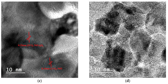 The TEM photographs of the S1 and S2 samples are displayed in Figure 5a,b. These images verify that neither the S1 nor the S2 samples contain any homogeneous particles with varying nano sizes in the 8–30 nm range. The results of the SEM and the XRD corroborate with these observations. However, these composites exhibit interconnected pseudo-spherical particles or cubic particles, with the elongated nano array structures having edges with low crystallinity. The as-prepared composite nanostructure was examined with high-resolution TEM (HR-TEM) images (Figure 5c,d) in order to analyze the deep morphological characteristics and to calculate the atomic d-spacing. According to (PDF Numbers. 78-0429 and 73-1702), the d-spacing for the (111) and (311) orientations of the NiO and NiCo2O4 crystallites, respectively, was calculated using the fringes seen in the HR-TEM images of the nanocomposites. The result was 0.24 nm, which is extremely close to the theoretical d-spacing.