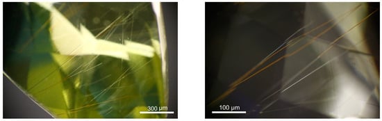 The internal inclusion features were observed under a gemological microscope of magnification up to 80×, equipped with various lighting conditions. A Cannon 500D (Kanagawa, Japan) camera was applied to capture the internal features of the chrysoberyl in this article.