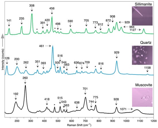 Figure 6. Raman spectra of sillimanite, quartz, and muscovite inclusions within the chrysoberyl host. Peaks in the inclusion spectra that are marked with an asterisk * are from the host chrysoberyl.