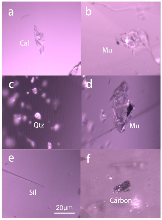 Figure 7. Several solid inclusions were found in the samples studied, including irregular calcite (a), muscovite (b,d), quartz (c), sillimanite (e), and carbon (f).
