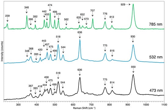 Moreover, we have applied three different lasers to the chrysoberyl host in this study to explore their spectral features, including 473, 532, and 785 nm. The typical spectrum is reported in Figure 8. All the samples are not oriented along their optical axis; thus, the spectrum should be classified as unoriented. In general, the 930 cm−1 peak appears at all three lasers as the strongest, while the 636 cm−1 peak appears weak in the 785 nm and strong enough to be a primary peak in the 532 and 473 nm lasers. By comparison, the 239 and 707 cm−1 can only be seen with the 785 nm laser. Accompanied by a series peak in the 300–600 cm−1 range, the 346 peak is prominent in the 785 nm, which is very weak in the 532 nm and nearly none in the 473 nm laser. The 930 cm−1 peaks can be excited by all three lasers, and such a feature agrees with a recent study [].