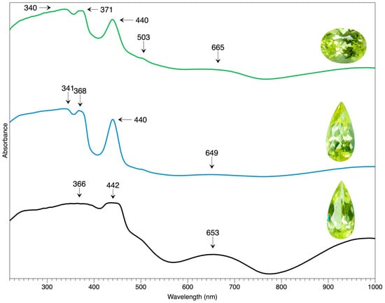 While all the samples are subjected to the UV-Vis test to explore their coloration, their typical spectra are selected to demonstrate their features in Figure 10. The 440 nm peak is the most prominent in the spectrum, as it is the primary coloration origin, usually along with a doublet peak at ~370 nm and a weak shoulder at 503 nm. The broad and weak band at 650–660 nm may add a subtle hue shift, while the 340 nm in the blue range may also result in a color shift. The abovementioned features agree with the previous study []. The 440 nm peak can be attributed to a trace of Fe substituting Al within the chrysoberyl crystalline structure.