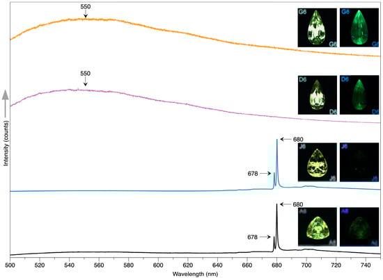 Chrysoberyl is not well known for its luminescence properties, except for some alexandrite varieties, colored by Cr or V, exhibiting a distinct color-changing effect and usually red fluorescence under 365 nm U.V. light. Interestingly, the canary yellow chrysoberyl in this study was inert under 365 nm and 254 nm U.V. light; however, it showed green fluorescence detected by the SYNTHdetect machine, and such phenomena have not been reported presently, according to the knowledge of the authors. Meanwhile, the photoluminescence spectra were also performed in all the samples, and the prominent broad band centered at 550 nm was distinct in samples showing strong green fluorescence. In comparison, the 550 nm band disappeared, and the 678 and 680 nm bands arose in samples with weak to inert fluorescence, as shown in Figure 11.