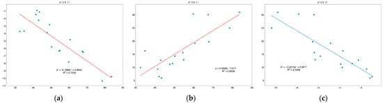 Figure 12. The CIELAB is plotting regarding the L*, a*, and b* values, respectively, the relationship between a* and L* (a), the relationship between b* and L* (b), the relationship between a* and b* (c).