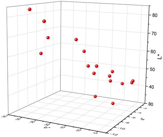 Figure 13. The 3D plotting of CIE data regarding L, a*, and b*.