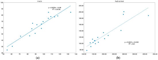 Figure 14. The plotting of V versus Cr (a) and Fe/V versus Fe/Cr (b).