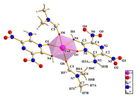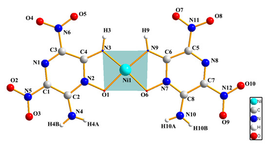 New energetic materials with high performance have been an urgent need in the military and aerospace industries [1,2,3]. Combining in-used energetic molecules with various metal cations to form energetic complexes is an important research direction in the design and synthesis of new energetic materials. Most studies have focused on compounds such as azide [4,5,6], hydrazine [7,8], triazole [9,10,11], and tetrazole [12,13], and their derivatives [14,15], due to their abundant coordination sites and high heat of formation which positively contribute to energy-level assurance. However, the properties of these ligands make it difficult for energetic complexes to meet both high energy and safety engineering requirements simultaneously. A typical example includes nickel hydrazine perchlorate (NHP) and cobalt hydrazine perchlorate (CHP), which possess detonation energies comparable to the two most commonly used organic explosives, pentaerythritol tetranitrate (PETN) and hexahydro-1, 3, 5-trinitro-1, 3, 5-triazine (RDX) [7]. Nevertheless, due to the low stability of perchlorate, the sensitivity of NHP and CHP remains exceptionally high, with NHP capable of detonating even in the absence of external stimuli, while CHP exhibits an impact sensitivity of 0.5 J or 20 cm (using a 2.5 kg weight). Therefore, the utilization of high-energy and low-sensitivity energetic molecules as ligands is crucial in obtaining energetic complexes with exceptional comprehensive properties.