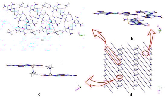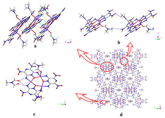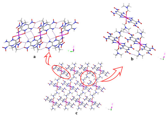 Furthermore, due to the presence of abundant hydrogen bonds (Table S5), N10–H10A···O3, N4–H4A···O2, N4–H4B···O4, N9–H9···O11, N3–H3···O11, and C9–H91···O9 hydrogen bonds, the nickel complex is linked into a molecular sheet, as shown in Figure 2a. Then, the formation of a three-dimensional (3D) supramolecular structure is facilitated by the π-stacking interactions, with a distance of 3.315 Å between the nitro group and the center of the pyrazine ring; electrostatic interactions, with a distance of 3.237 Å between the un-deprotonated amino groups and nickel ions; as well as weak hydrogen bonding (C11–H11A···O8) between DMF and LLM-105, as depicted in Figure 2b–d.