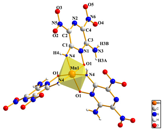 Compound 3 crystallizes in the trigonal space group R-3. The LLM-105 molecules were also deprotonated, and each manganese atom is coordinated by three symmetrically related LLM-105 anions, forming a distorted octahedral geometry, as shown in Figure 5. Therefore, the three coordination bonds of Mn–N are symmetrically equal, with a bond length of 1.893(3) Å. The Mn-O bonds are in the same situation with a bond length of 1.906(2) Å. It is worth mentioning that the Mn(III) ion in the complex results from the oxidation of the Mn(II) ion in the raw material, MnCl2, due to the variable valence state of Mn in solution [23,24,25]. This oxidation of Mn(II) can also be confirmed by the shorter Mn-N and Mn-O bonds in compound 3 compared to those in the other six-coordinated Mn(II) complexes in the literature [26,27,28], which is normally larger than 2.0 Å.