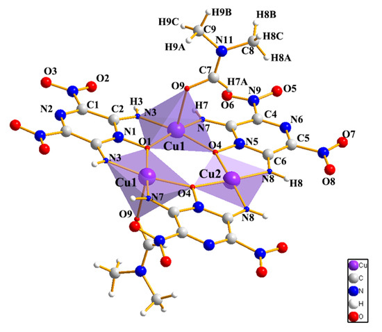 Compound 4 crystallizes in monoclinic space group C2/c. Unlike other LLM-105-based complexes, both amino groups of LLM-105 in 4 are deprotonated, enabling it to efficiently coordinate with copper ions as a tridentate ligand. Ultimately, complex 4 shows a trinuclear structure comprising three central Cu(II) ions, three LLM-105 anions, and two DMF molecules, as seen in Figure 7. Two of the copper atoms (Cu1) exhibit a five-coordinated configuration which are symmetrically related, while the remaining copper atom (Cu2) exhibits a four-coordinated configuration.