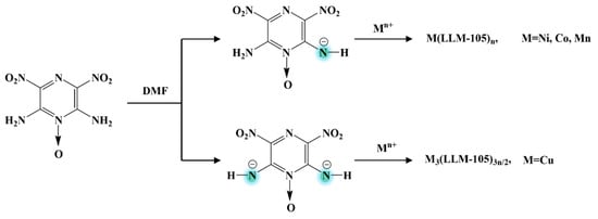 2,6-diamino-3,5-dinitropyrazine-1-oxide (LLM-105) has garnered significant attention for its high thermal stability and insensitivity to friction, shock, impact, and electrical spark [16,17,18,19]. As a result of these properties, it is considered as a promising alternative to 2, 4, 6-triamino-1, 3, 5-trinitrobenzene (TATB) for use as an insensitive detonator or main charge. As a polyamino-polynitro pyrazine nitrogen oxide, LLM-105 serves as an excellent example of a nitrogen-rich energetic ligand. However, due to the lack of knowledge regarding to coordination chemistry of LLM-105, it is still a big challenge to synthesize the metal complexes of LLM-105. To the best of our knowledge, only three complexes of LLM-105 with Cu(II), Co(III), and Pb(II) as the metal center have been synthesized so far [20,21]. In addition, the crystal structure of the Pb(II) complex of LLM-105 failed to be determined by a single-crystal X-ray diffraction technique (SCXRD). Here, the Co(II), Mn(III), and Ni(II) complexes of LLM-105 were first synthesized and confirmed by SCXRD. We also report another Cu(II) complex of LLM-105 with a coordination pattern that is completely different from the previously reported one. The synthesis route was illustrated in Scheme 1. These findings will markedly expand the coordination chemistry and potential applications of LLM-105.